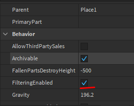 Filtering Enabled, jest to rzecz która blokuje graczom dostęp do "ServerSide" serwera. Innymi słowami gracz nie ma wpływu na serwer, a czasami serwer nie ma wpływu na gracza, tak też jest w przypadku PlayerGui. Więc jak jest to możliwe że istnieją okienka sklepu? To proste, ponieważ istnieje coś takiego jak "Remote Event" i "Remote Function" jak to działa? Opowiem w innym poradniku. Oczywiście Filtering Enabled można wyłączyć. By to zrobić musimy wejść w Properties Workspace