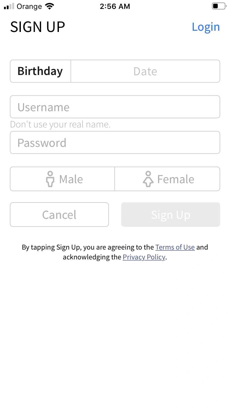 Po włączeniu aplikacji Roblox na urządzeniu należy kliknąć w niebieski przycisk "Sign Up" znajdujący się w prawym dolnym rogu ekranu. Po wciśnięciu, w rubryce "Birthday" należy wpisać swoją datę urodzenia, w oknie "Username" - swoją nazwę użytkownika (nie zaleca się używania swojego imienia i nazwiska), a w "Password" - hasło do konta. Na koniec należy wybrać płeć. Klikając przycisk "Sign Up" po wypełnieniu wszystkich rubryk akceptujemy warunki korzystania i politykę prywatności.