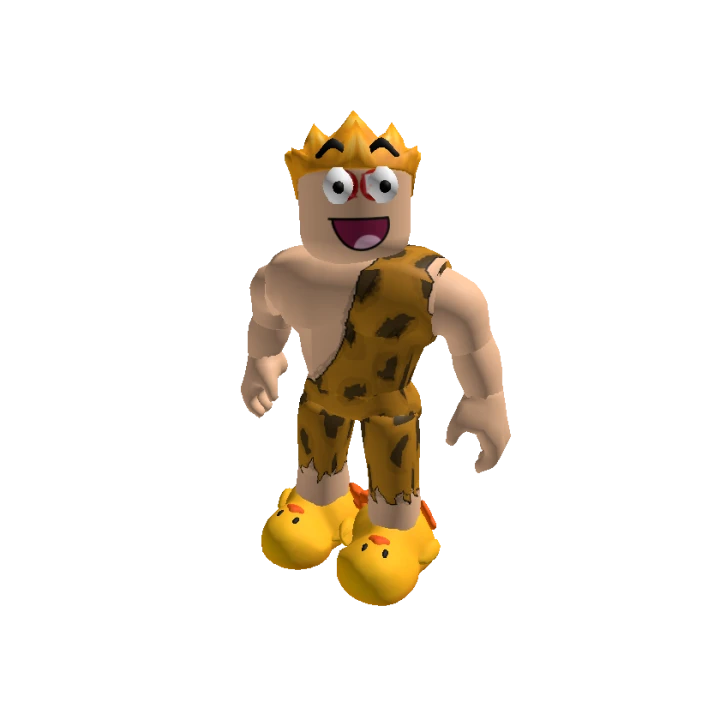 Жёлтые светлые волосы с золотыми наушниками, мускулистое тело, чёрные штаны, жёлтые ботинки в виде уток, на спине посох с робуксом