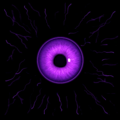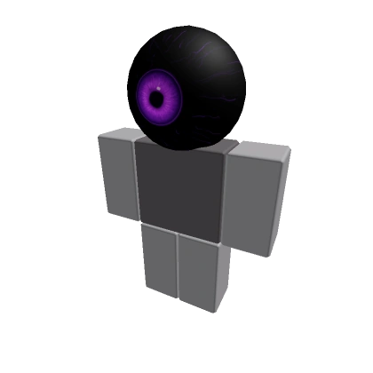 Гигантское чёрное глазное яблоко с радужкой цвета маджента и несколькими выделяющимися фиолетовыми кровеносными сосудами на поверхности, которое полностью покрывает голову персонажа.