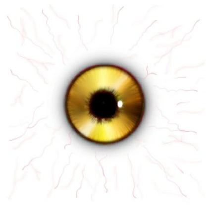 Гигантское глазное яблоко с позолоченной блестящей радужкой и несколькими выделяющимися кровеносными сосудами на поверхности, которое полностью покрывает голову персонажа.