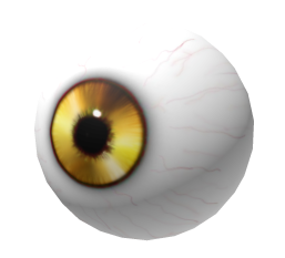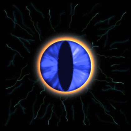 Гигантское чёрное глазное яблоко с радужкой ультрамаринового цвета, которая излучает золотистое свечение, вертикальным кошачьим зрачком и несколькими выделяющимися зелёными кровеносными сосудами на поверхности, которое полностью покрывает голову персонажа.
