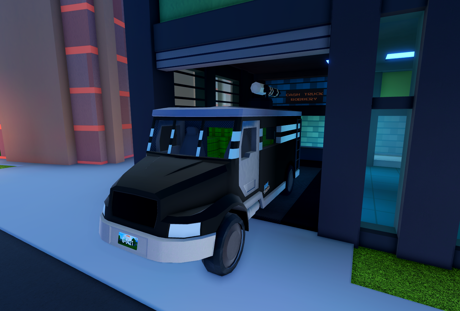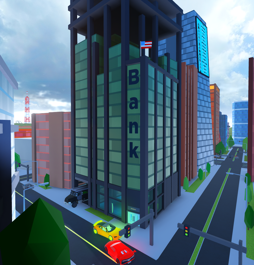 Чтобы войти у вас должна быть карточка полицейского. При входе через стальную дверь, начнется ограбление. Банк является единственным местом ограбления в Jailbreak, где локация ограбления меняется. Есть несколько видов ограблений, и они отличаются. Вам придется интуитивно ограбить банк, уворачиваясь от лазеров. После подходите к сейфу, начнется закладка взрывчатки. Когда сейф откроется от взрыва, заходите в него и деньги сами будут накапливаться. Когда деньги перестанут накапливаться, выходите из сейфа и бегите к одному из выходов. Первый – через который вы начинали ограбление, но для этого нужен ключ. Второй – люк. Для открытия люка, найдите около сейфа ещё одну дверь, заминируйте её и после пройдите испытания, где в конце будет лестница вверх. Люк откроется и вы выйдите. После того когда все участники ограбления выйдут из банка, он закроется. Если же полицейский зайдет в комнату сейфа, все участники, находящиеся на территории банка, будут осведомлены об их присутствии.