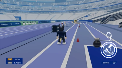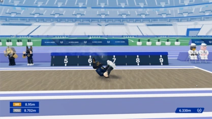 Players sprint down a runway and jump as far as they can into the sand pit. While sprinting, players rapidly press the sprint button to maintain their speed; then make their jump before the foul line. Crossing the foul line results in a disqualification.