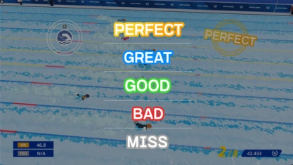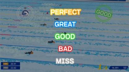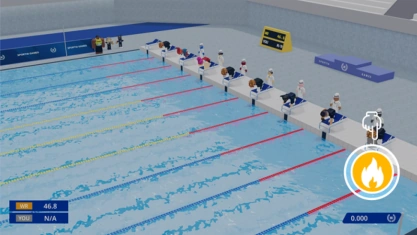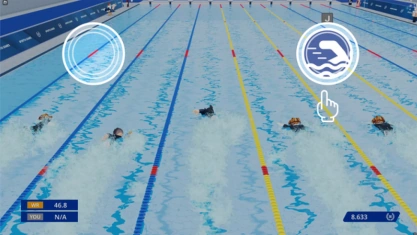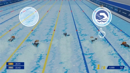 Players race in lanes in a swimming pool. When the starting signal sounds, players can press the boost button to begin swimming. Pressing it before the boost signal results in a foul. While swimming, players press the stroke buttons at the right time to maintain their speed.