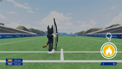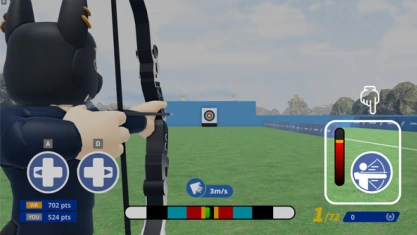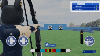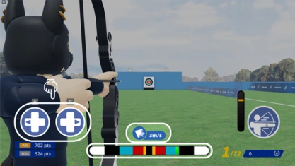 Players use a bow to shoot at a target. The boost button can be pressed to start the round. Players adjust their wind bar to align it close to the center depending on the wind speed. The shoot button can be held to activate the power gauge, then the shoot button can be released to shoot. There are 5 rounds, the first player to score 6 set points wins.