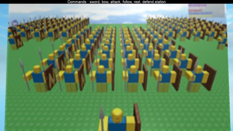 In this experience, there are two opposing teams, the Red Team and Blue Team. Players spawn with a sword and a bow. Players are supposed to create their own clones and order them by using chat commands. Typing the following commands will make the players clone observe a certain behavior. The objective is to steal the enemies flag and bring it to your flagpole.