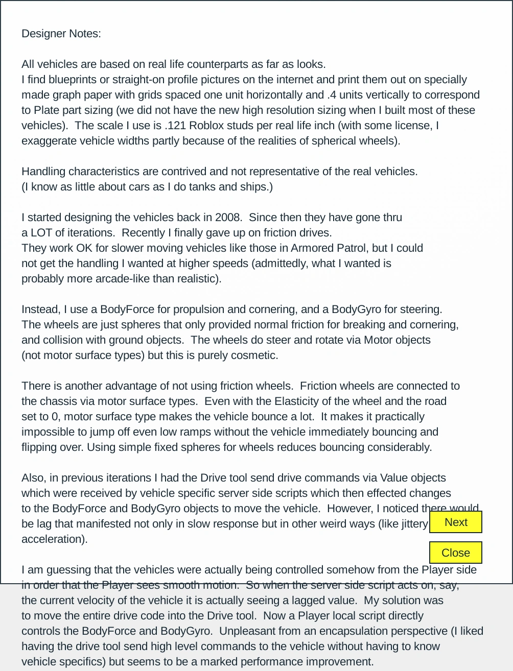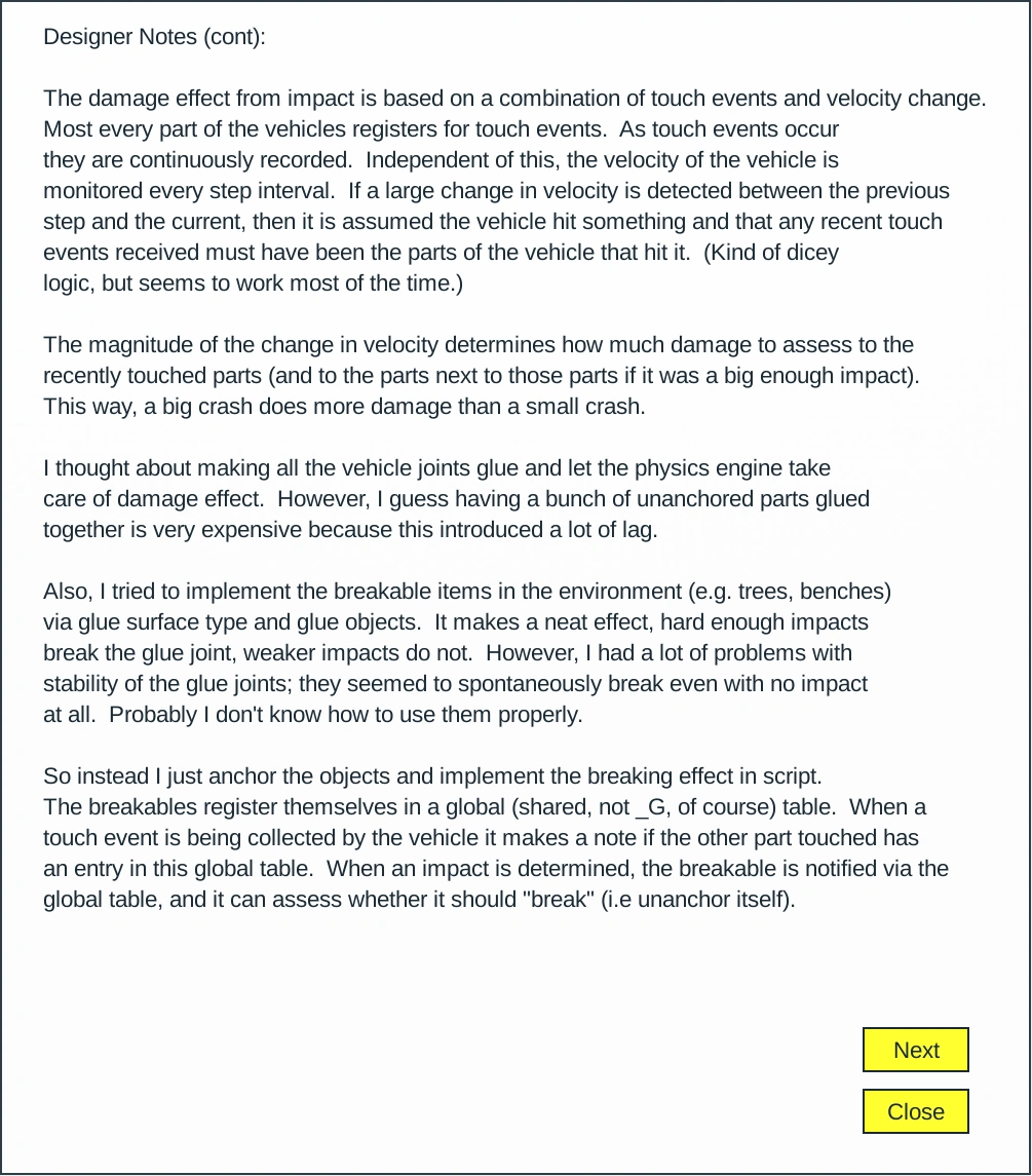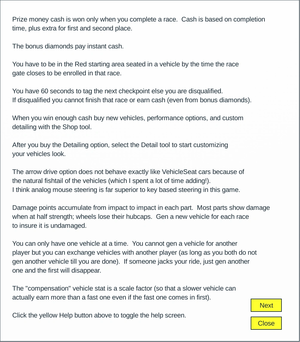 Years before the release of Checkpoint Racing, the place was TestTrack. This place was likely a precursor to Checkpoint Racing; it existed as early as February 27, 2009. By June 27, 2009, TestTrack was gone, and it became unused 2. By July 29th, it was briefly used as a beta place for Armored Patrol v3.0. By August 30, 2009, it was back to being unused 2, this time with a different baseplate. By August 23, 2010, it had become unused 3. On November 13, 2010, Checkpoint Racing was released. November 13, 2010 - Checkpoint Racing v1.0 November 16, 2010 - Checkpoint Racing v1.0 (disabled) January 15, 2011 - Checkpoint Racing v2.0 January 22, 2011 - Checkpoint Racing v2.1 March 19, 2011 - Checkpoint Racing v3.0 March 21, 2011 - Checkpoint Racing v3.0 (fixed shop) August 6, 2011 - Checkpoint Racing v3.1 (Data persistence!) November 23, 2011 - Checkpoint Racing v3.2 January 13, 2012 - Checkpoint Racing v3.3 March 30, 2012 - Checkpoint Racing v3.3 ~ 2012 - Checkpoint Racing v3.4 May 20, 2012 - Checkpoint Racing v3.5 If you get the forever loading problem, try picking a server with only a few players on it. As always, have fun! June 13, 2012 - Checkpoint Racing v3.6 June 29, 2012 - Checkpoint Racing v3.7 August 6, 2012 - Checkpoint Racing v3.7 September 8, 2012 - Checkpoint Racing v3.8 February 26, 2013 - Checkpoint Racing v3.8 June 17, 2013 - Checkpoint Racing v4.0 (Also, all vehicles that expired while the game was down should also be saved forever.) Fixed the square hubcaps! If you saved a painted vehicle it may still have square hubcaps. You can fix them yourselves using Paint. (You can't change back to square though, so it may become a collector's item!) As always, have fun! November 12, 2013 - Checkpoint Racing v4.1 May 22, 2014 - Checkpoint Racing v4.1 (Shutdown) August 18, 2014 - Checkpoint Racing v4.2b September 2, 2016 - Checkpoint Racing v5.1 Note: version 5.x is completely reworked, uses FilteringEnabled, has different vehicles, and has a different save strategy. Because of these and other reasons, unfortunately, I had to reset everyone. My apologies to those with saved vehicles from before. Note: I do plan to add the exterior customizations I had before (like decals). FilteringEnabled makes this more challenging. There is some (very) minimal support for mobiles/tablets. If problems, let me know. As always, have fun! November 7, 2025 - Checkpoint Racing v5.1 |