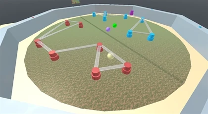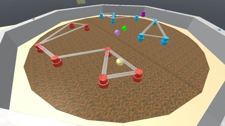 The map itself consists of a large octagonal arena wall surrounding a field. The field is a large rusted circle. Based on old game thumbnails, the circle was likely supposed to resemble grass, but Roblox updates changed its appearance over time to look more rusted. On top of the arena wall are 3 spawn pads on the sides for both teams, and a billboard likely used for the game's thumbnail back in v1.0. Within the walls perimeter, towers will respawn at the start of every round. Interestingly, the towers are made of several rectangles to form a cylinder instead of just using a cylinder. The tower configuration appears to be randomized at the start of every match, but it remains the same throughout each 5 rounds. A random configuration for the towers will be made for the red team, and then flipped for the blue team. Bridges will be formed between towers near each other. Every tower will try to generate 2 - 4 bridges. Half of the bridge is connected to either end of the tower. A slightly transparent rusted line runs through the middle of the circle; it's slightly darker than the rest of the field, and it's known as the neutral zone. The balls will spawn randomly along the neutral zone when the game begins.