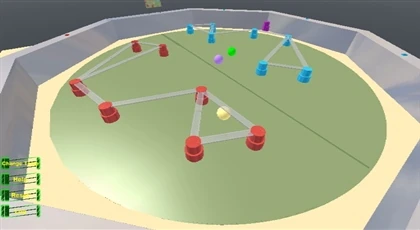 The goal of the game is to push the balls into the enemy towers to destroy them using lasers; the team that destroys the most towers wins. The game ends when all towers are destroyed or when the timer runs out. When a tower is hit with a ball, it will explode, and the half of the bridge connected to that tower will disappear piece by piece. When the green and purple balls go out of bounds, they will move back to the center of the map. When the yellow ball goes out of bounds, it will be moved to the opposite side and given fast velocity. A ball is considered out of bounds when it rolls off the field onto the base floor. If a player tries to touch a ball, they will die as if they exploded.