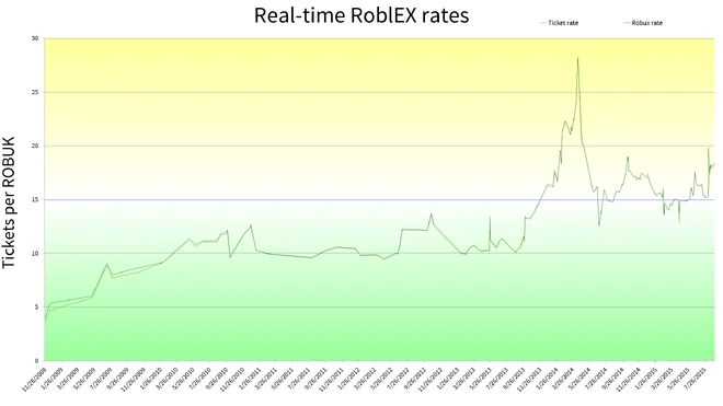 - 2008-2009: In 2008, and early 2009, the rates were very low (3-4 tickets per 1 Robux). However, in mid-2009, the RoblEX rates raised, rose to 7-8 tickets per 1 Robux.
