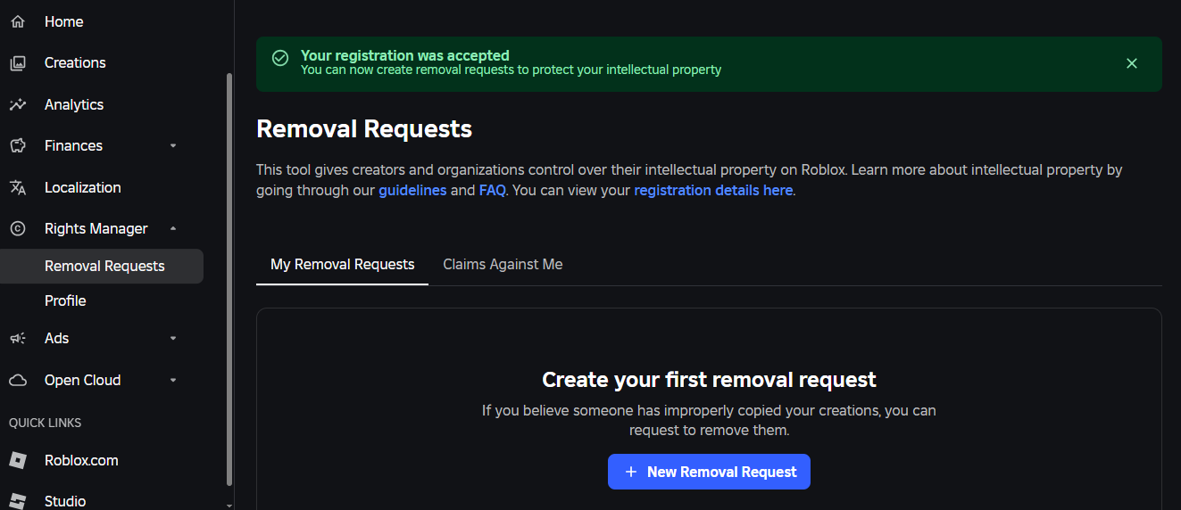 - Submit and Await Approval: once holders submit the registration, Roblox will review your application to confirm your legal authority to enforce IP rights within around few hours or a day. Upon approval, you’ll gain access to Rights Manager to submit IP removal requests. Roblox discards personal data from your documents after verification, except for your date of birth, which is used to ensure account age accuracy and not shared with reported parties.