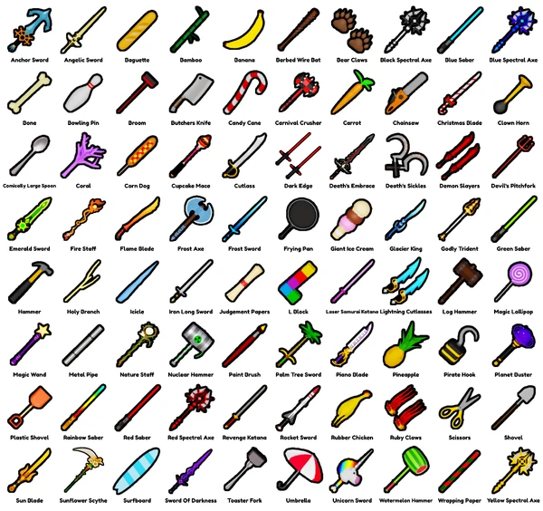 Weapons Weapons are skins replacing the player's weapon in combat-based minigames. There are 80 weapons to collect in Socks Minigames.