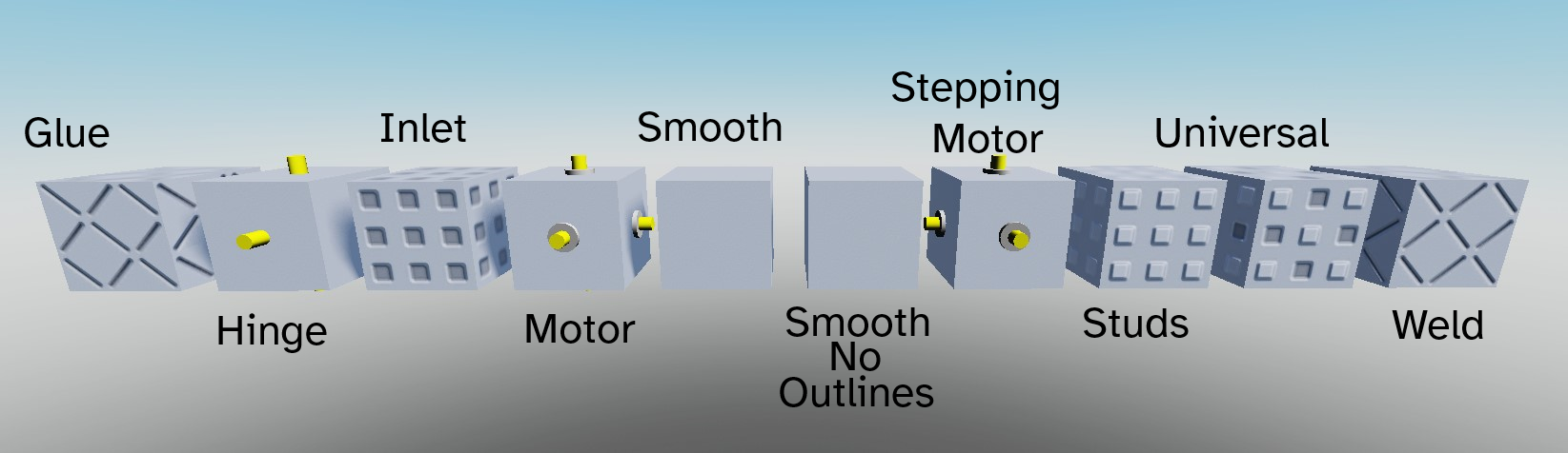 Surfaces refer to the six sides of a part, each of which can be changed through its corresponding surface property (e.g. TopSurface). Surfaces are represented by the SurfaceType enum, which currently has ten kinds of surfaces. Each surface type exhibits different behaviors when interacting with each other, but primarily functions as a decoration.