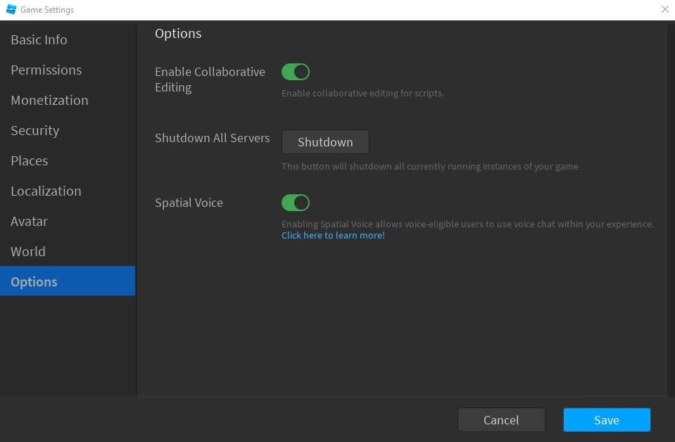 Voice chat option in Roblox Studio.